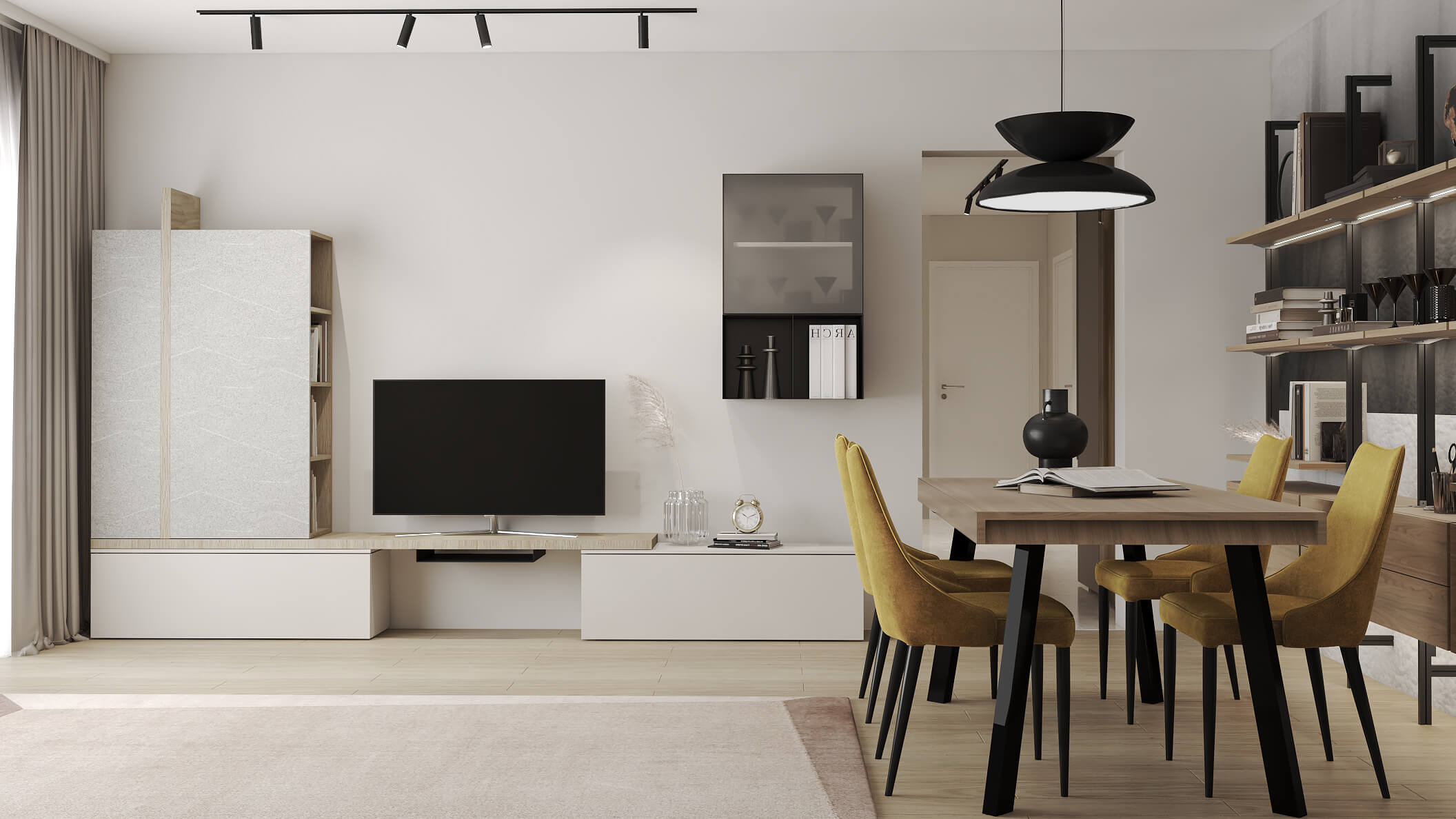 Într-un design interior „Moderno”, veți întâlni în principal culori neutre și pastelate, cum ar fi alb, gri, bej sau nuanțe de crem. Aceste culori subtile creează o bază calmă și spațioasă, punând accentul pe formele și texturile obiectelor de mobilier.